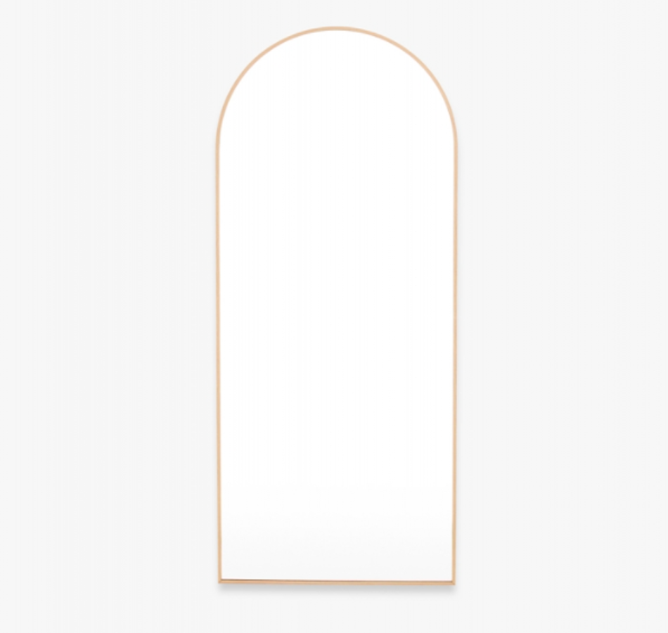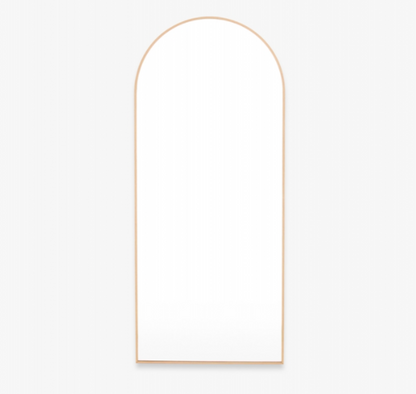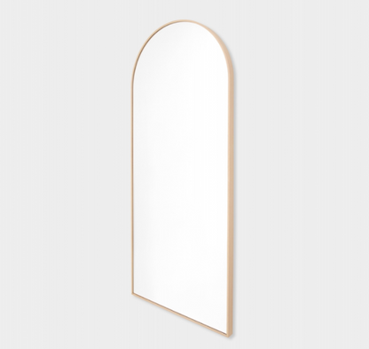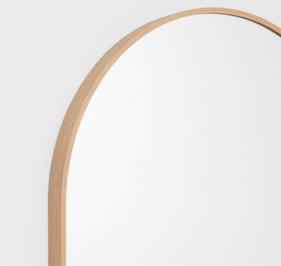 Mirrored glass, aluminium frame with light timber-look synthetic wrap, engineered wood backing. This mirror is fitted with a keyhole fixture for direct hanging.